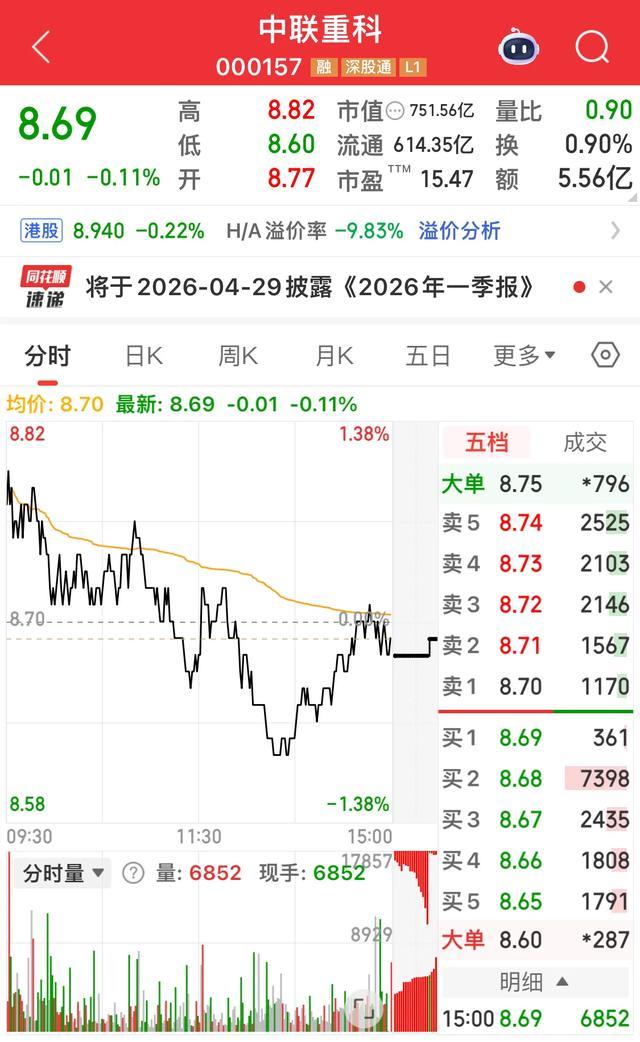 中联重科(000157)今天开盘8.77元,小幅高开0.8%,可惜好景不长,很快就撑不住了,盘中最低砸到8.60元,全天振幅2.53%,收盘8.69元,跌了0.11%,成交量6387.7万手,成交额5.56亿。跌得倒不多,但这种冲高回落的走法最伤士气!中联重科搞工程机械,按理说基建数据一出来它该跟着喝口汤,结果今天板块整体疲软,工程机械板块微跌,它也跟着蔫了。跟特变电工一比,板块强弱差距一目了然。