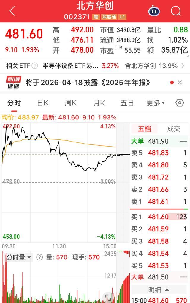 北方华创(002371)今天开盘478.00元,最高492.00元,最低476.11元,收盘481.60元,涨了1.93%,成交量7.41万手,成交额35.87亿。别看最后是涨的,盘中可没少折腾人,上午一度被砸绿,下午才慢慢爬回来。消息面上,寒武纪、芯源微这些芯片股开盘跌超5%,半导体板块整体挨了一闷棍。北方华创毕竟是国产半导体设备龙头,公司刚完成大规模定向增发,募资85亿用于半导体装备产业化基地扩产,机构资金盯得紧,抗跌能力比一般芯片股强出一截。