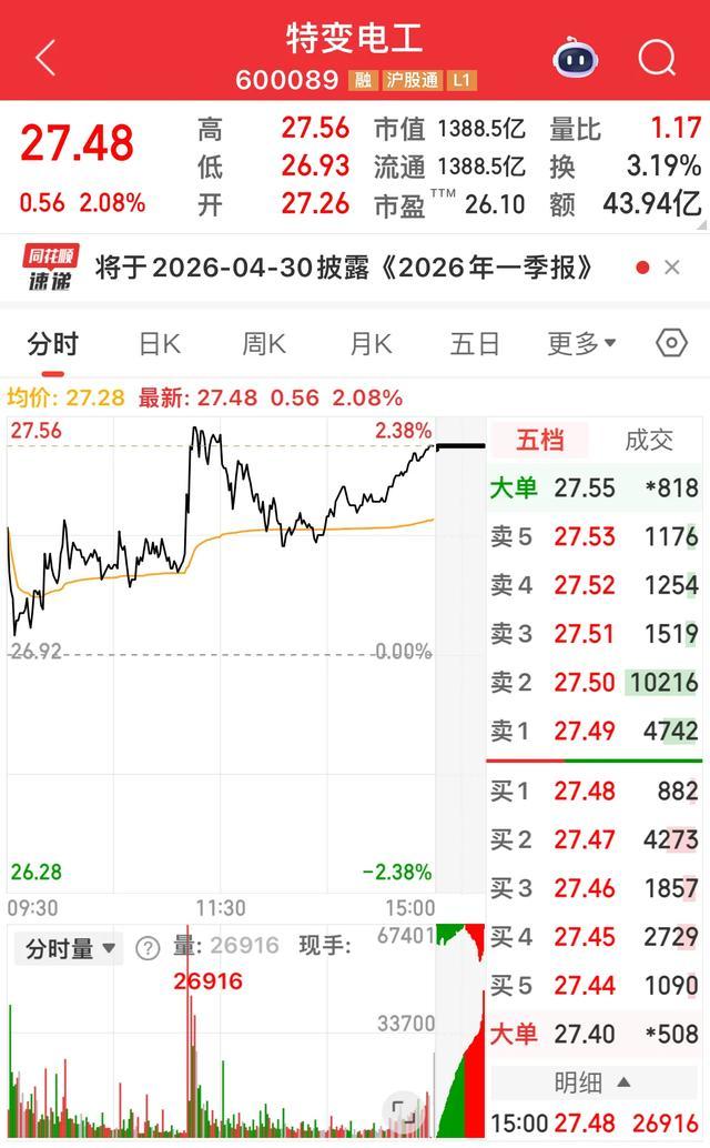 特变电工(600089)今天开盘27.26元,高开1.26%,成交量1.61亿手,成交额43.94亿,最高冲到27.56元,全天振幅2.34%,收盘报27.48元,涨了2.08%。这走势,延续了昨天的强势,放量往上拱。特变电工主打输变电、新能源和新材料,电力设备这条线今天上午公布的基建数据还不错,它盘子大、业绩稳,大资金敢进也敢拿,底气足。